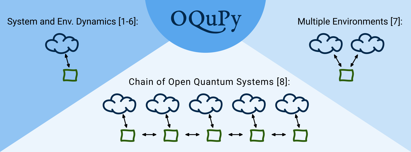 This multi-environment feature was implemented in OQuPy with minimal adjustment of the existing code. One can simply follow the procedure for building a process tensor (as outlined here) of each environment and then submit them in a list to the compute_dynamics function.